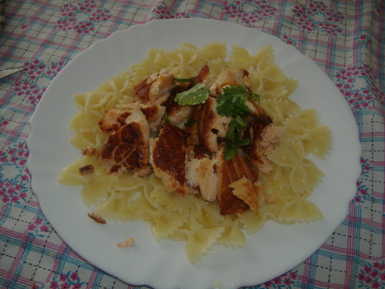 Escorre a massa, coloca no prato, acrescenta as lascas de salmão e guarnece com o molho.